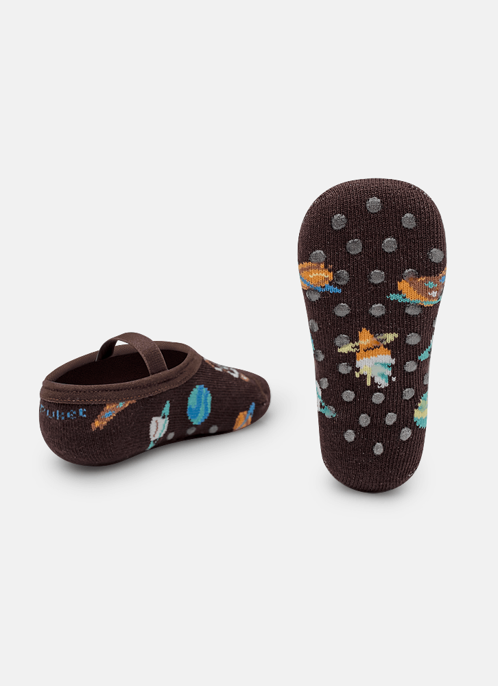 Meia com modelagem de sapatilha no tema Guaxinim Chocolate.