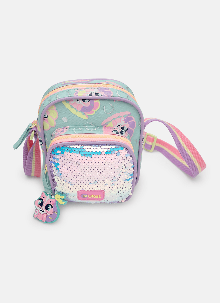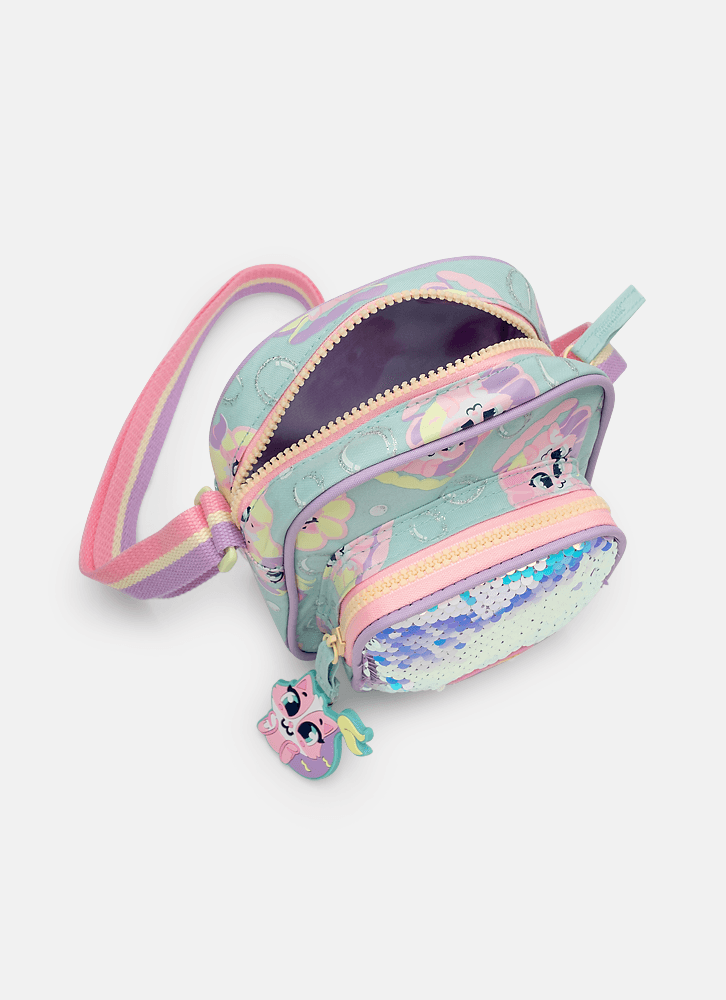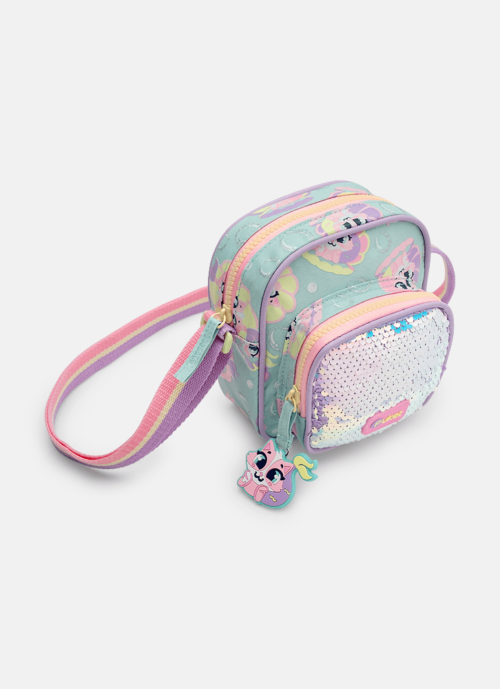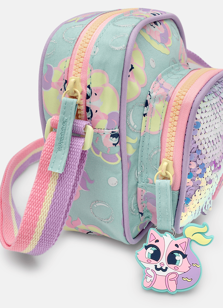 Bolsinha com estampa corrida de gata sereia, bolso frontal em paetê reversível. Possui alça regulável.