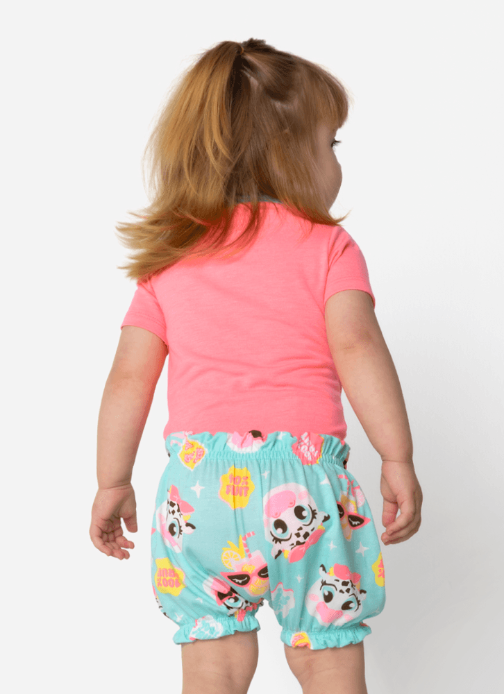 Shorts estampado com elástico macio embutido na cintura e aplicação de babadinhos na barra;