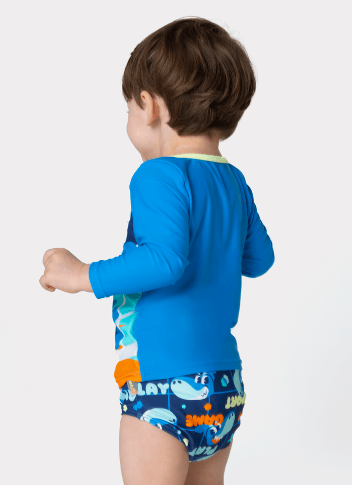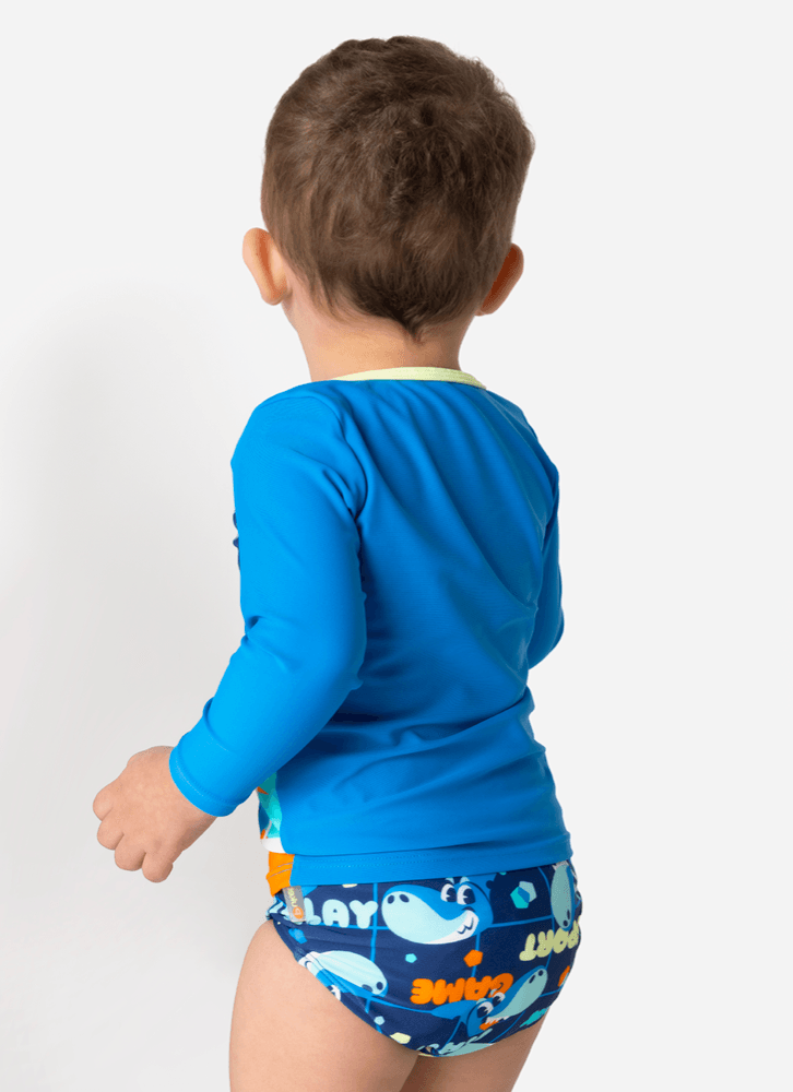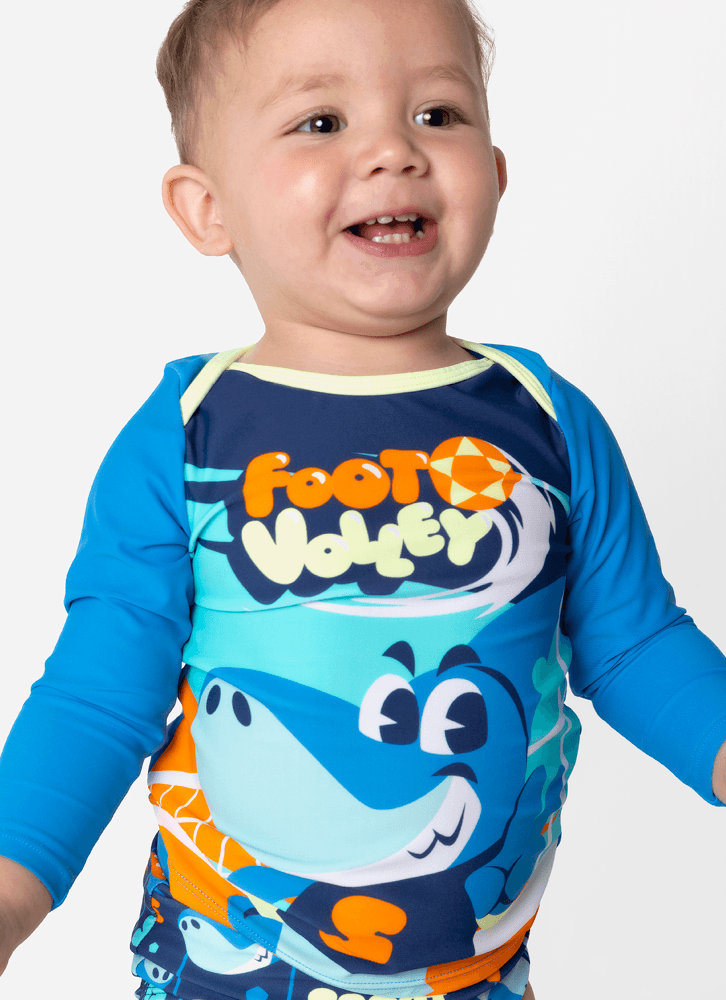 Conjunto baby Tuba Futevôlei camiseta e tapa fraldas. Possui ombros expansíveis e tapa fraldas com cós de elástico embutido e cordão interno para ajuste. Estampa frontal toque zero na camiseta e sunga em estampa corrida.