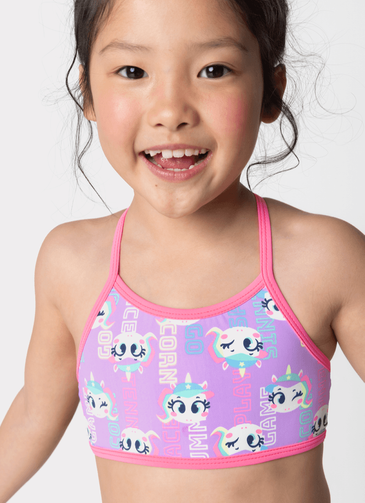 Biquíni kids. Possui estampa corrida e alças com cruzamento nas costas.