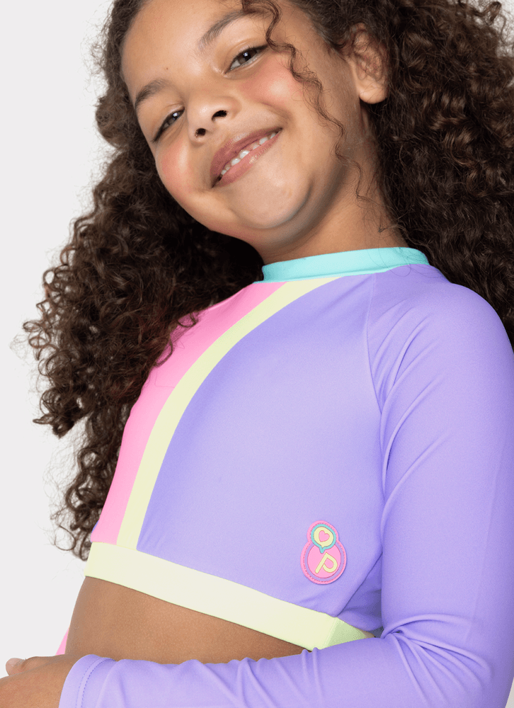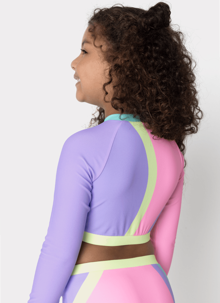 Conjunto cropped kids Colorful. Estampa toque zero na frente e nas costas. Aplique emborrachado do logo.
