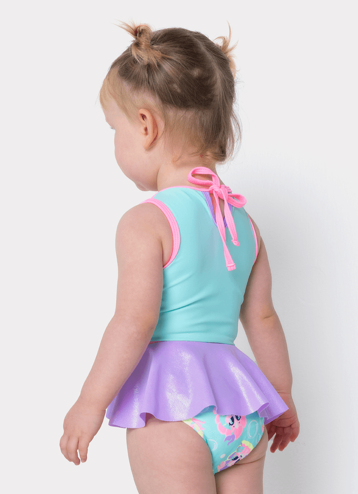 Maiô baby Gata Sereia. Possui ajuste de tamanho nas costas e botão de pressão no entrepernas. Estampa frontal toque zero na parte superior e estampa corrida na inferior. Aplique de babados com cobertura de foil holográfico