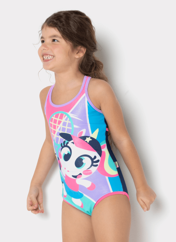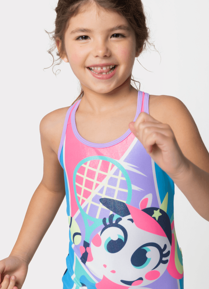 Maiô kids Uni Tênis. Possui alças com cruzamento nas costas. Estampa frontal toque zero com cobertura de foil holográfico.