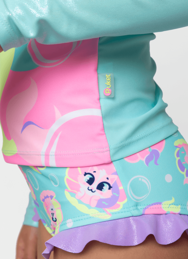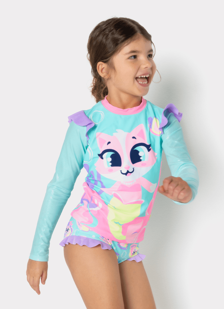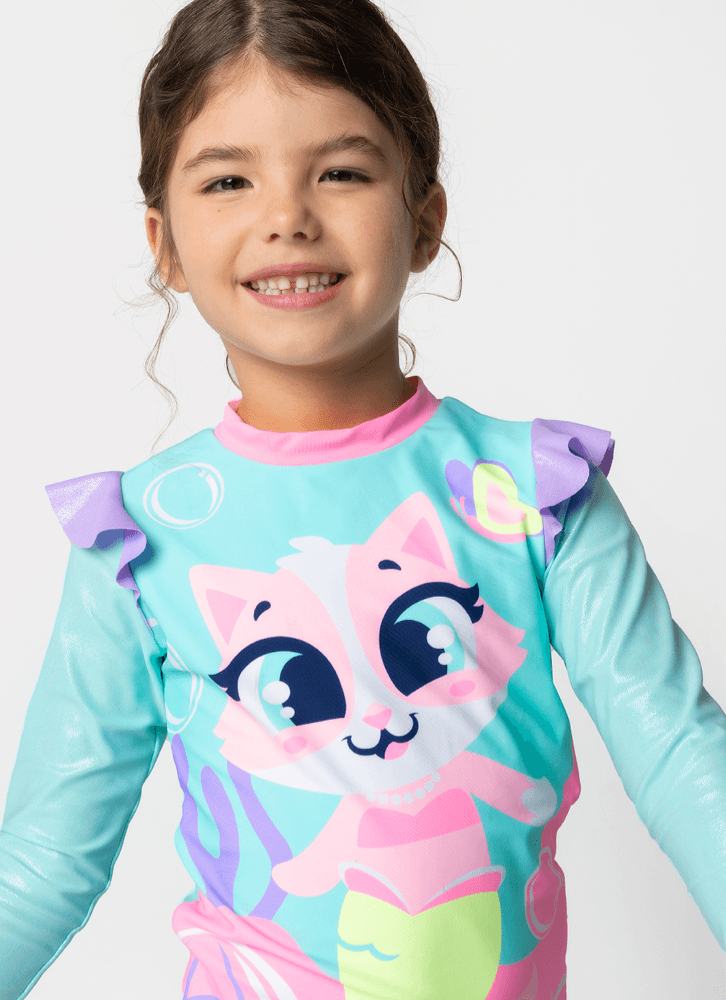 Conjunto camiseta kids Gata Sereia. Possui manga longa e estampa frontal toque zero. Mangas e aplique de babado na camiseta e na calcinha com cobertura de foil holográfico.