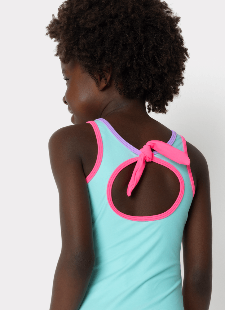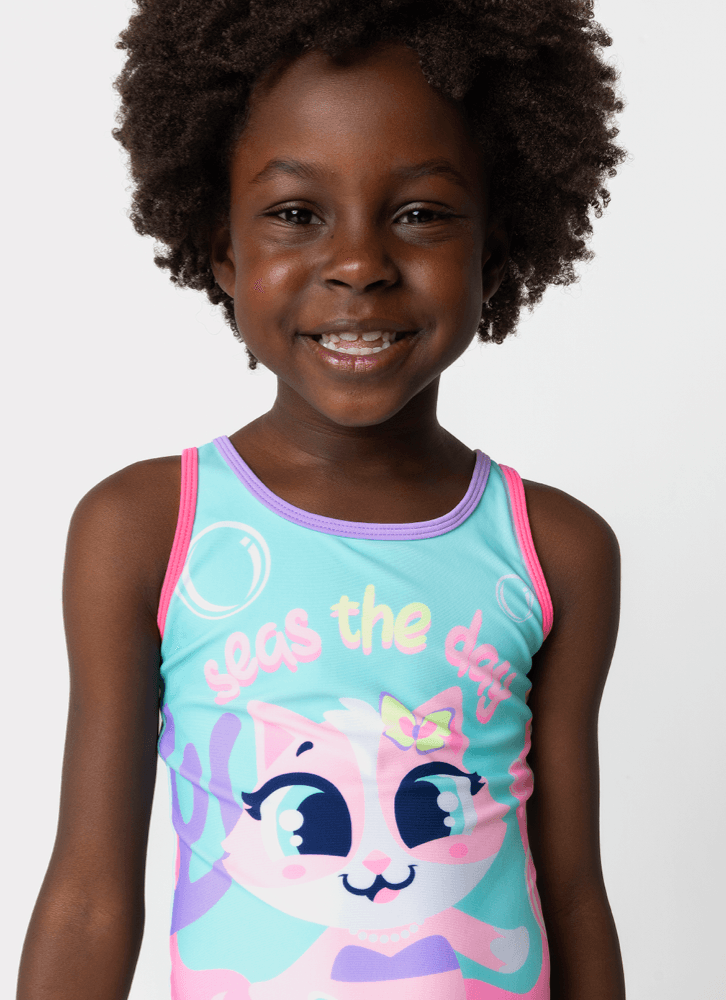 Maiô kids Gata Sereia. Possui ajuste de tamanho nas costas. Estampa frontal toque zero.