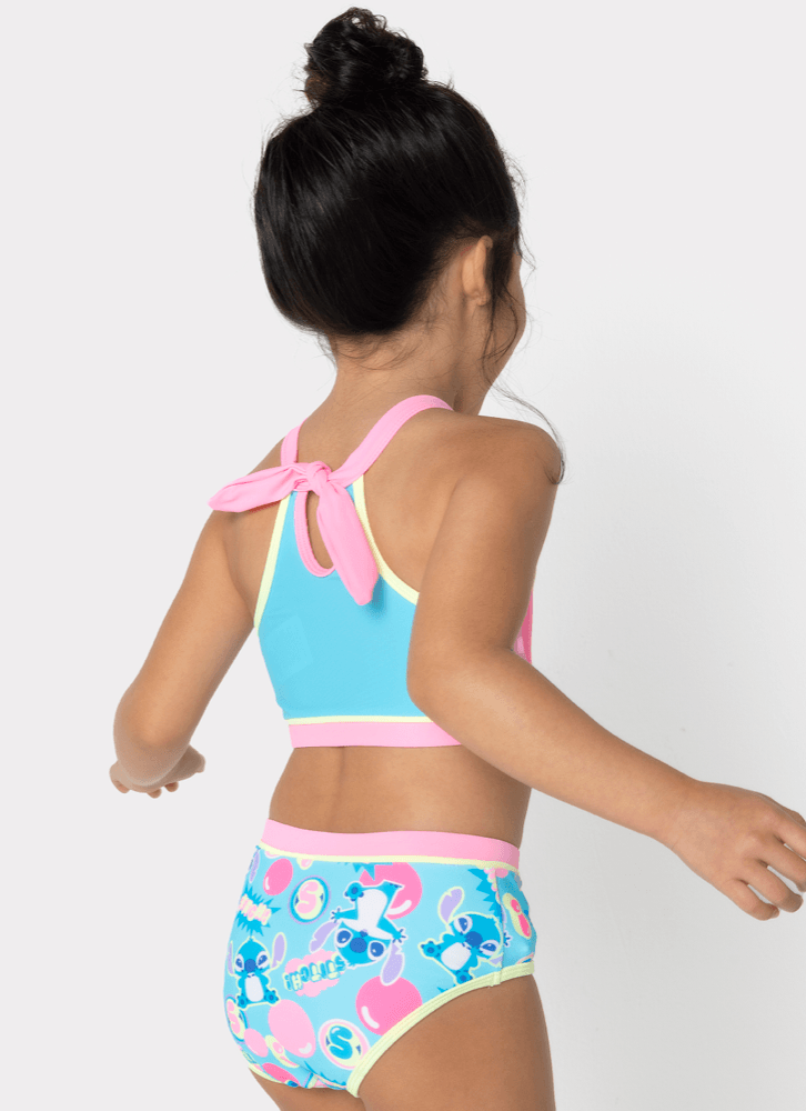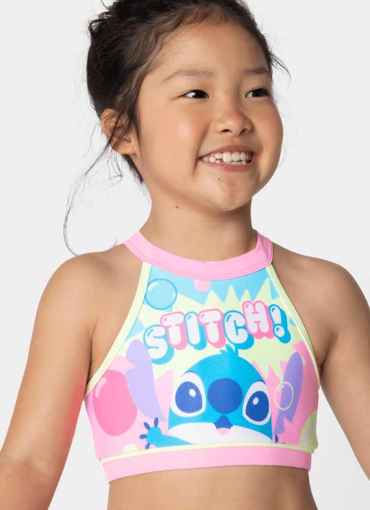 Biquini kids Stitch. Possui ajuste de tamanho nas costas e estampa frontal toque zero com cobertura de foil transparente.