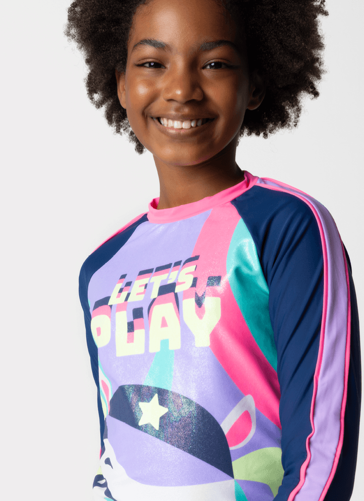 camiseta teen. Possui manga longa raglan, recortes multicoloridos na manga e estampa frontal toque zero com cobertura de foil holográfico.