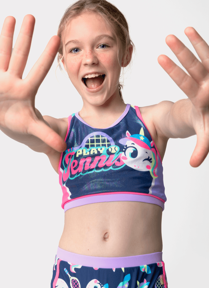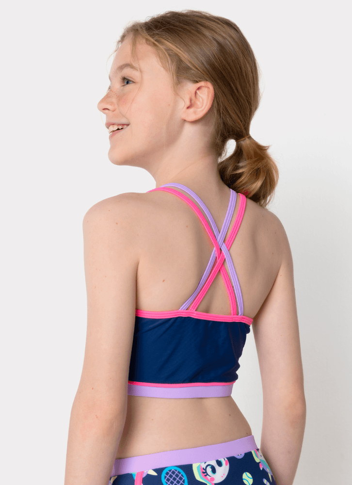 Biquini teen Uni Tênis. Possui alças duplas coloridas com cruzamento nas costas, calcinha em estampa corrida sem costura lateral e estampa frontal toque zero com cobertura de foil holográfico.