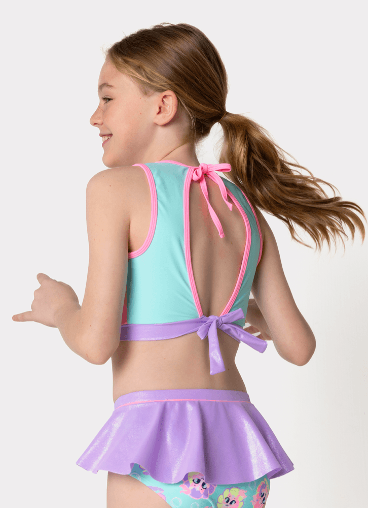 Biquini teen gata sereia.Possui top com ajuste duplo nas costas e estampa frontal toque zero. Faixa do top e aplique de babado na calcinha com cobertura de foil holográfico.