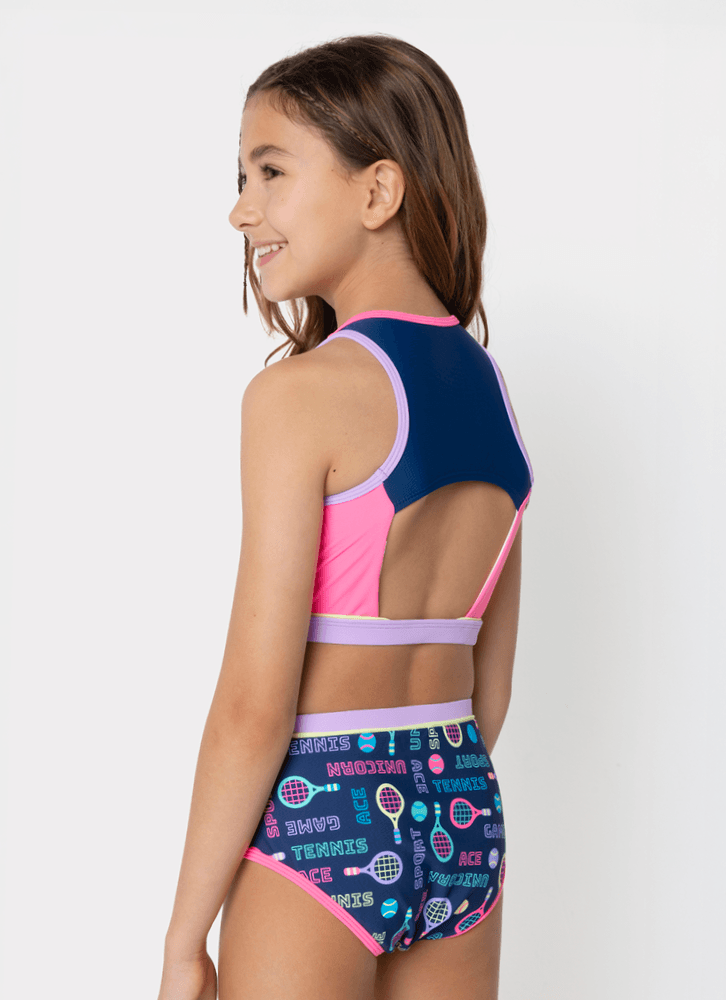 Biquini teen Uni Tênis. Possui top com abertura nas costas, recorte lateral colorido e estampa frontal em silk.