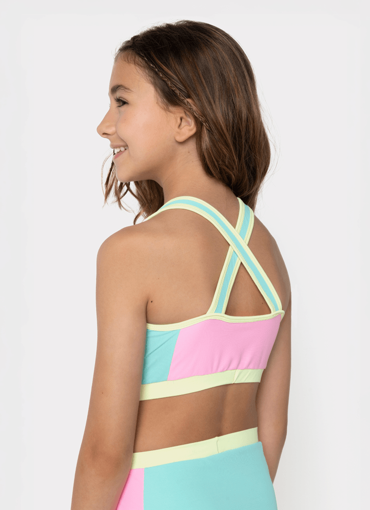 Biquini teen color block verde água. Tecido canelado, alças com cruzamento nas costas e recortes com blocos de cor contrastantes.