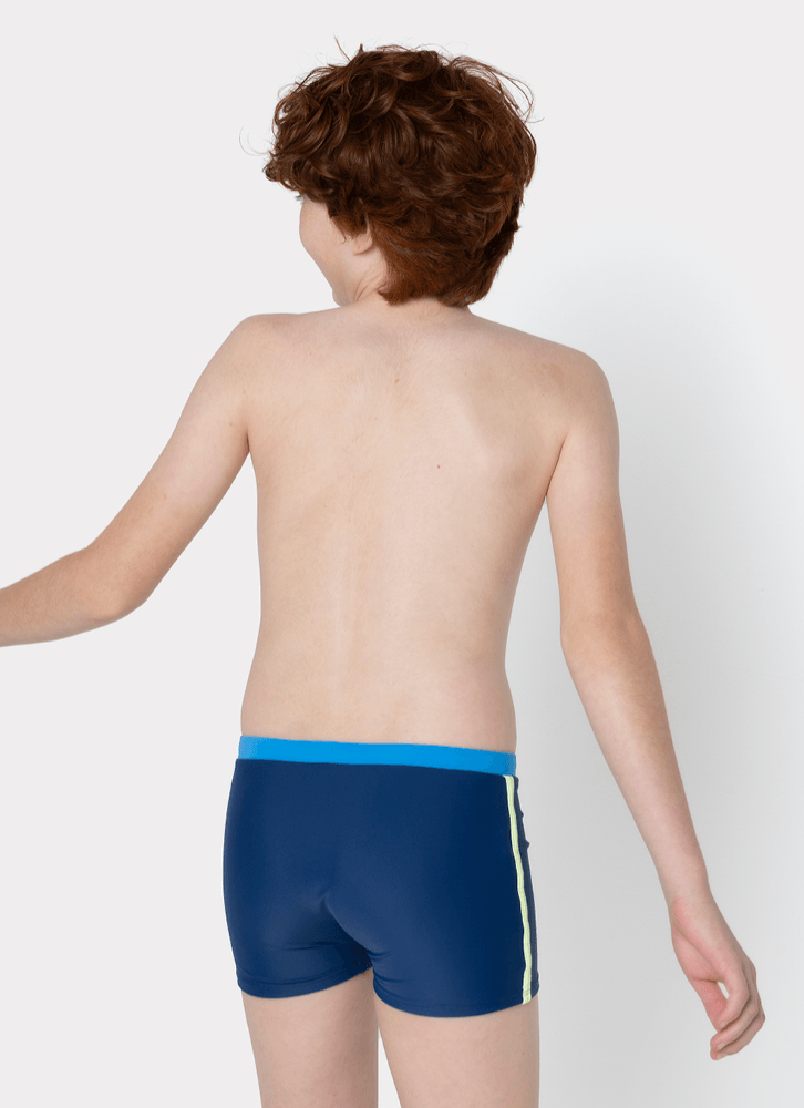 Sunga boxer teen Tuba Futevôlei. Possui cós com elástico embutido e cordão interno para ajuste. Estampa em silk localizado na lateral e aplique de viés contrastante na lateral.
