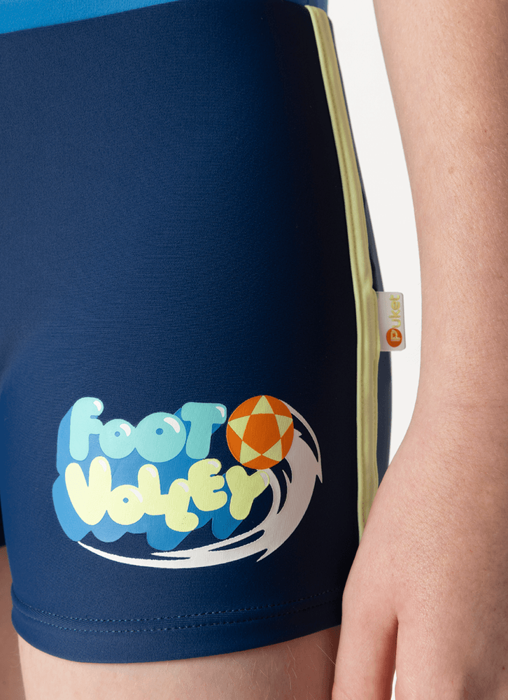 Sunga boxer teen Tuba Futevôlei. Possui cós com elástico embutido e cordão interno para ajuste. Estampa em silk localizado na lateral e aplique de viés contrastante na lateral.