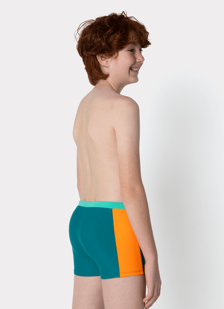 Sunga boxer . Possui cós com elástico embutido e cordão externo para ajuste. Estampa em silk localizado na lateral e recorte contrastante na lateral.