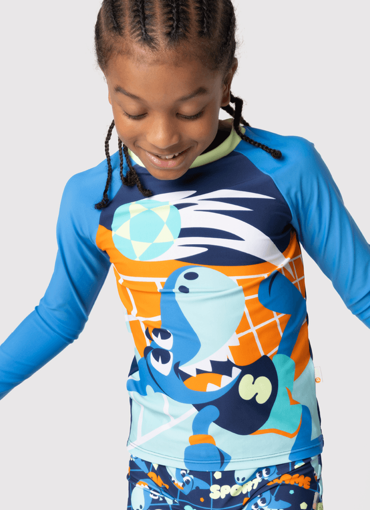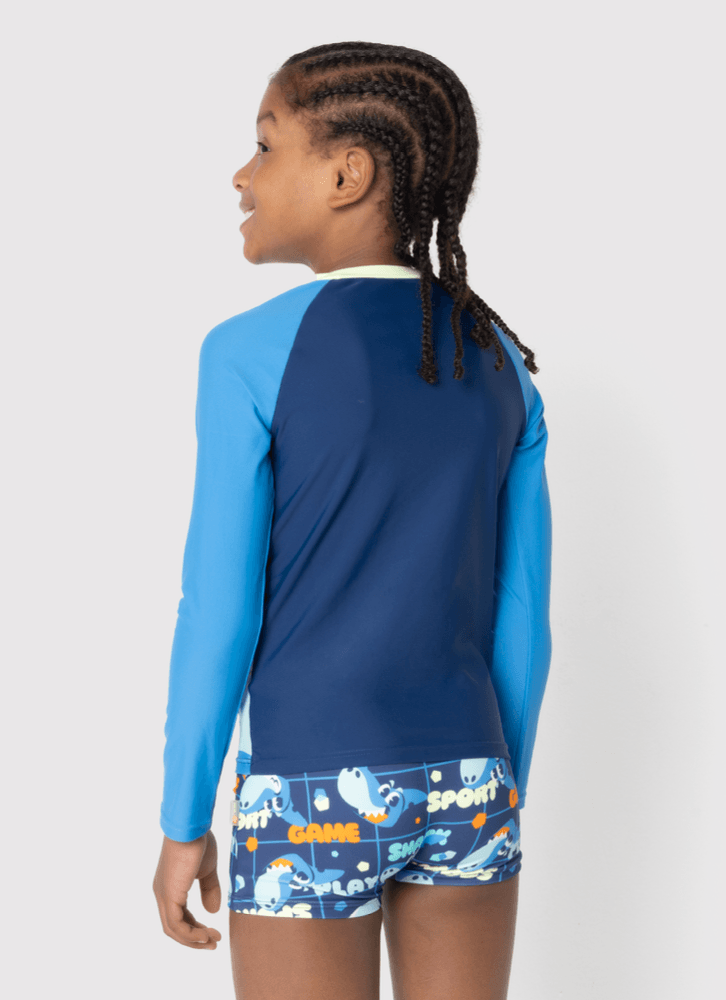 Conjunto camiseta e sunga boxer Tuba Futevôlei. Possui manga longa raglan e sunga com cós com elástico embutido e cordão externo para ajuste. Estampa frontal toque zero na camiseta e sunga em estampa corrida.
