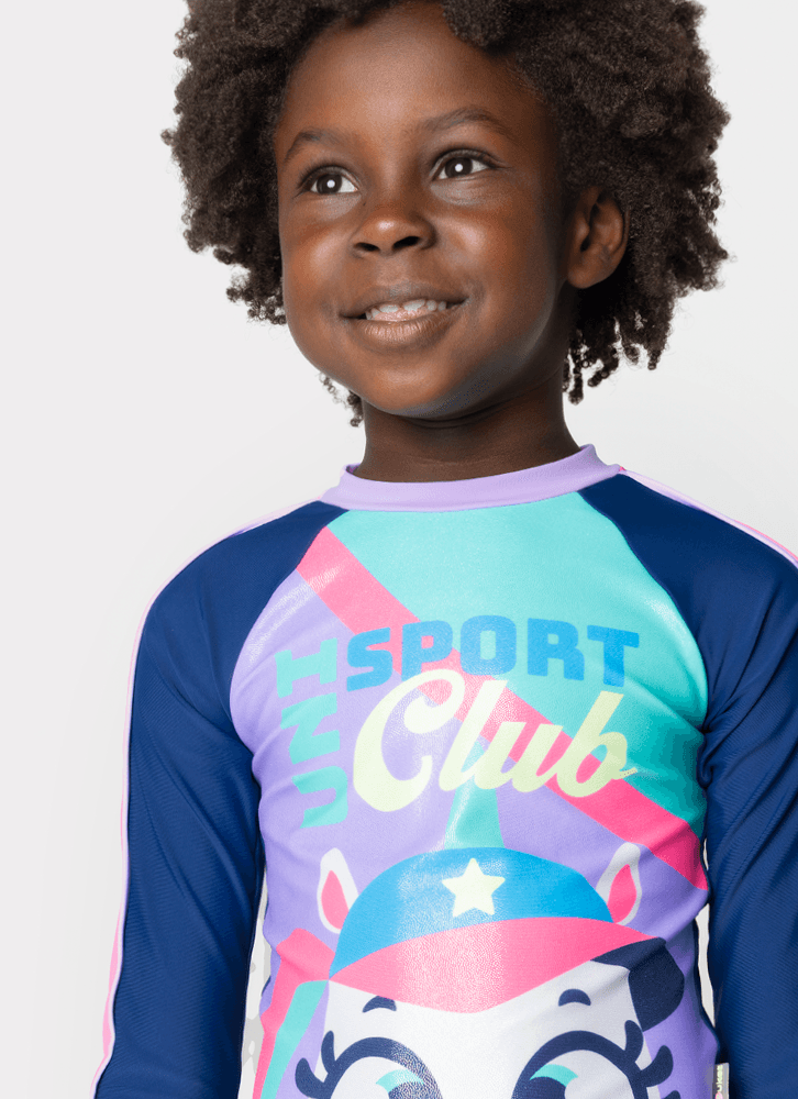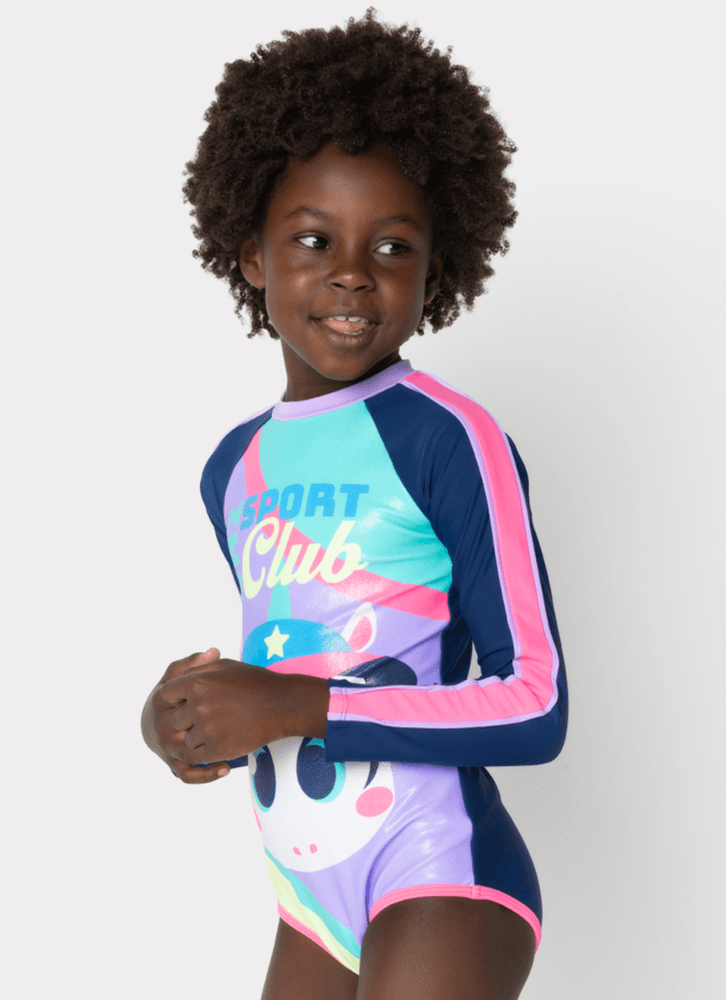 Maiô kids Uni Tênis. Possui manga longa raglan, abertura com zíper nas costas, recortes multicoloridos na manga e estampa frontal toque zero com cobertura de foil holográfico.