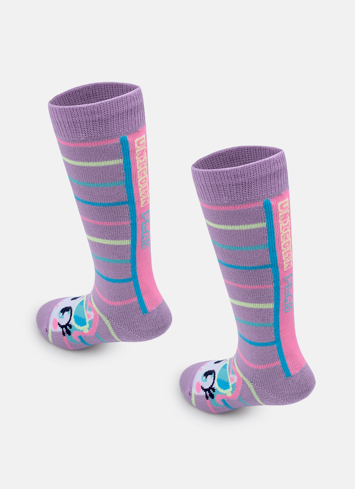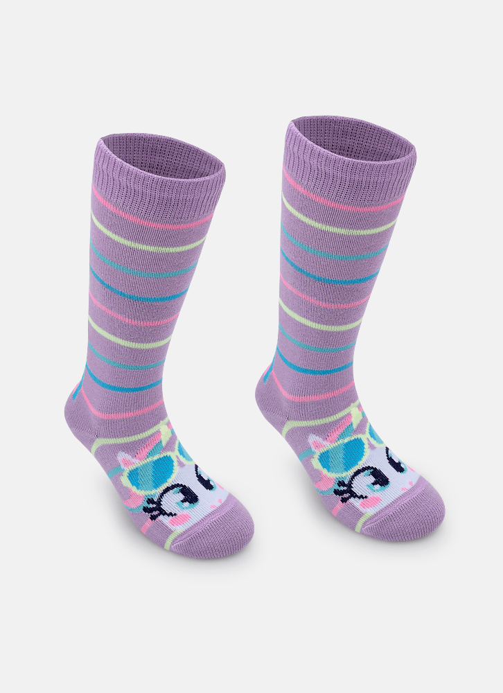 Meia 3/4 com desenho do tema de unicórnio, possui cano longo abaixo do joelho.