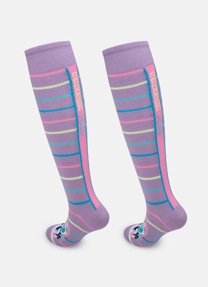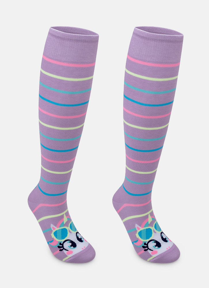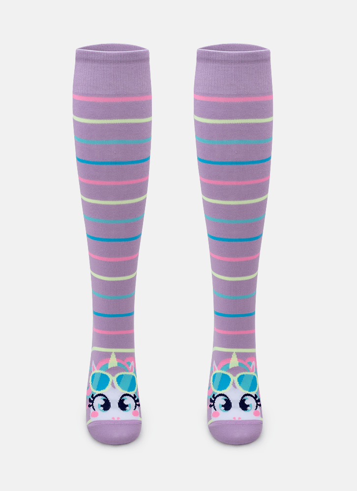 Meia 3/4 com desenho do tema de unicórnio, possui cano longo abaixo do joelho.