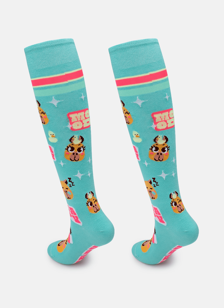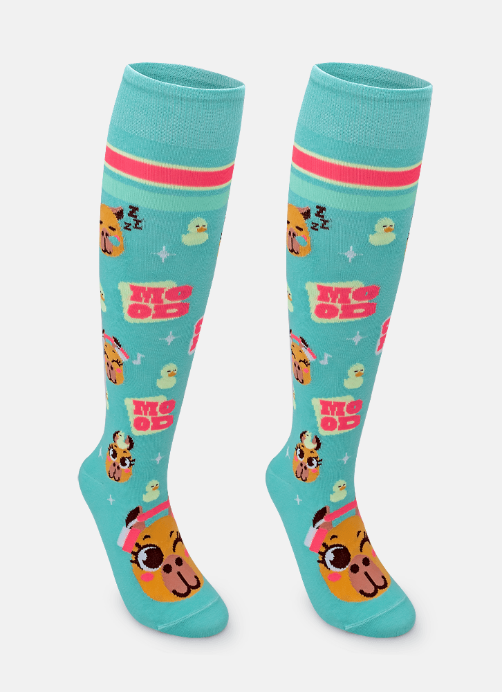 Meia 3/4 com desenho do tema de capivara, possui cano longo abaixo do joelho.