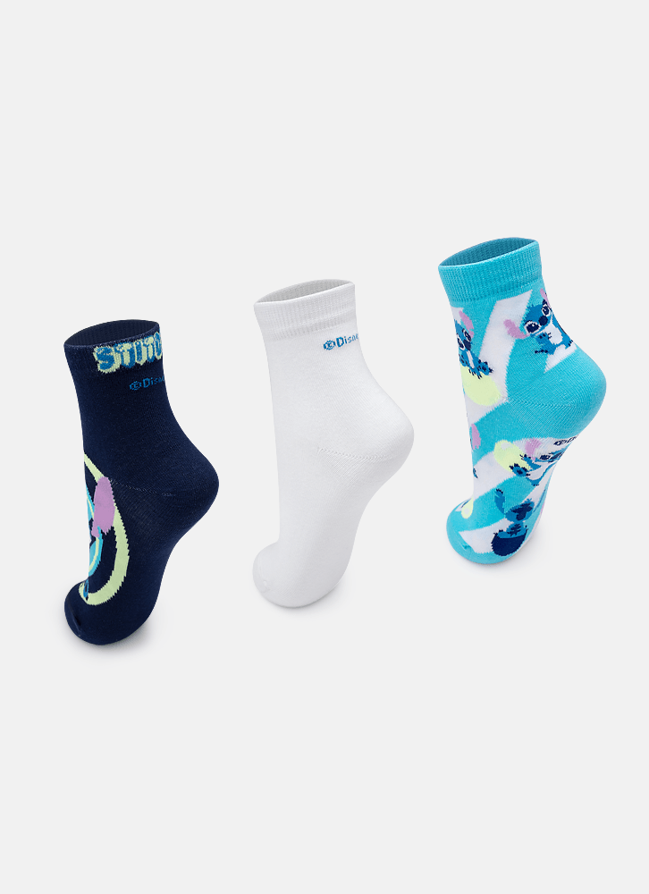 Kit com três pares de meias em algodão macio e poliamida no desenho, sendo duas com desenhos divertidos de Stitch e uma em cor lisa.