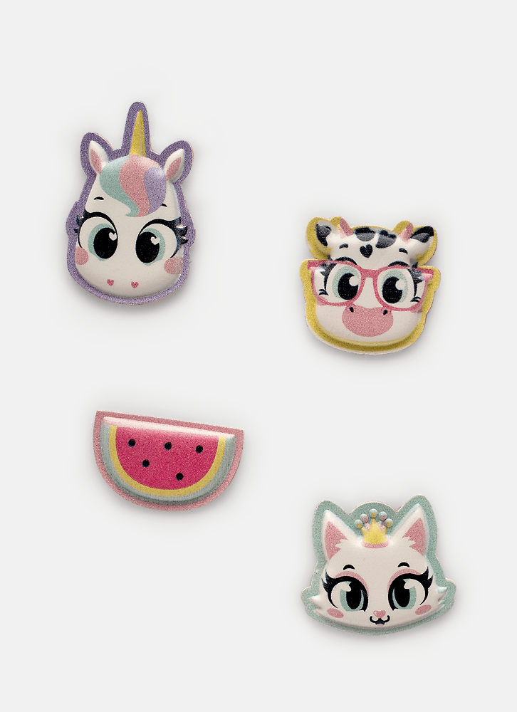Chinelo modelo slide de PVC emborrachado. Possui fivelas para ajuste e acompanha cartela de adesivos para customização.
