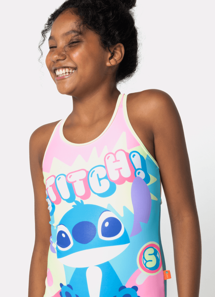 Maiô teen. Possui alças com cruzamento nas costas. Estampa frontal toque zero com cobertura de foil transparente.