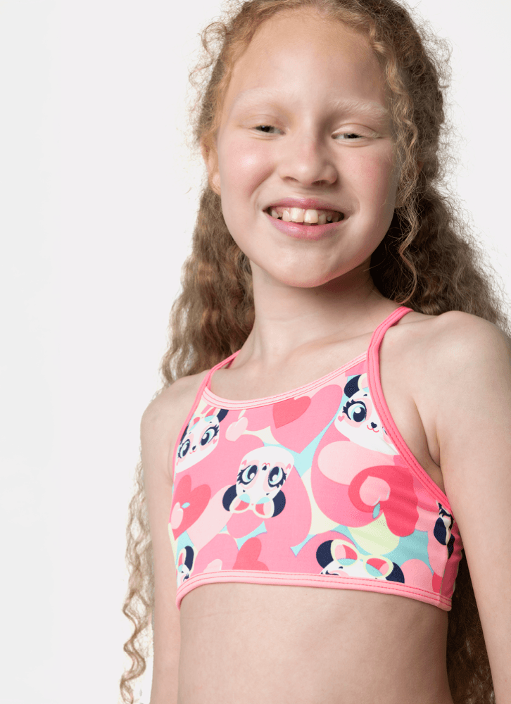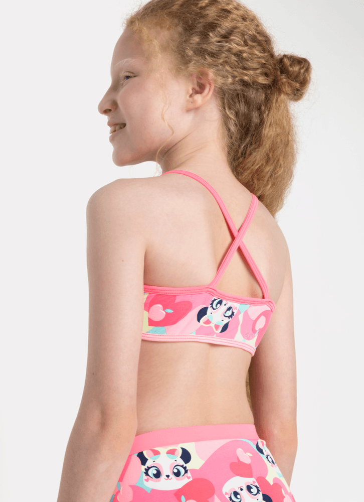 Biquíni teen 10/12 anos Panda Romântico. Possui estampa corrida e alças com cruzamento nas costas.