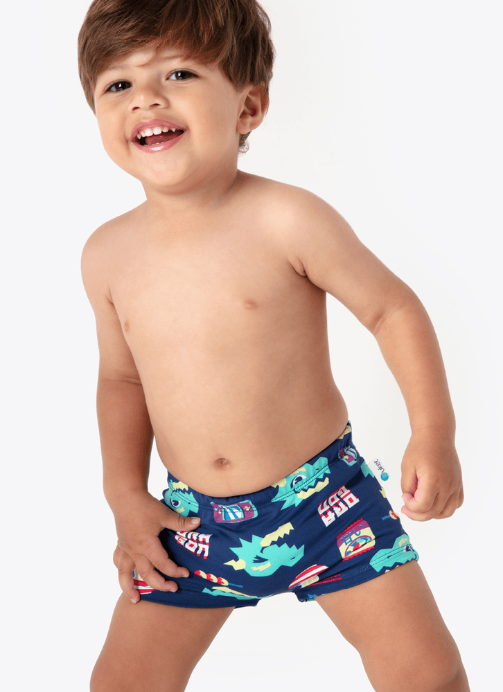 Sunga boxer em estampa corrida. Possui cós com elástico embutido e cordão interno para ajuste.