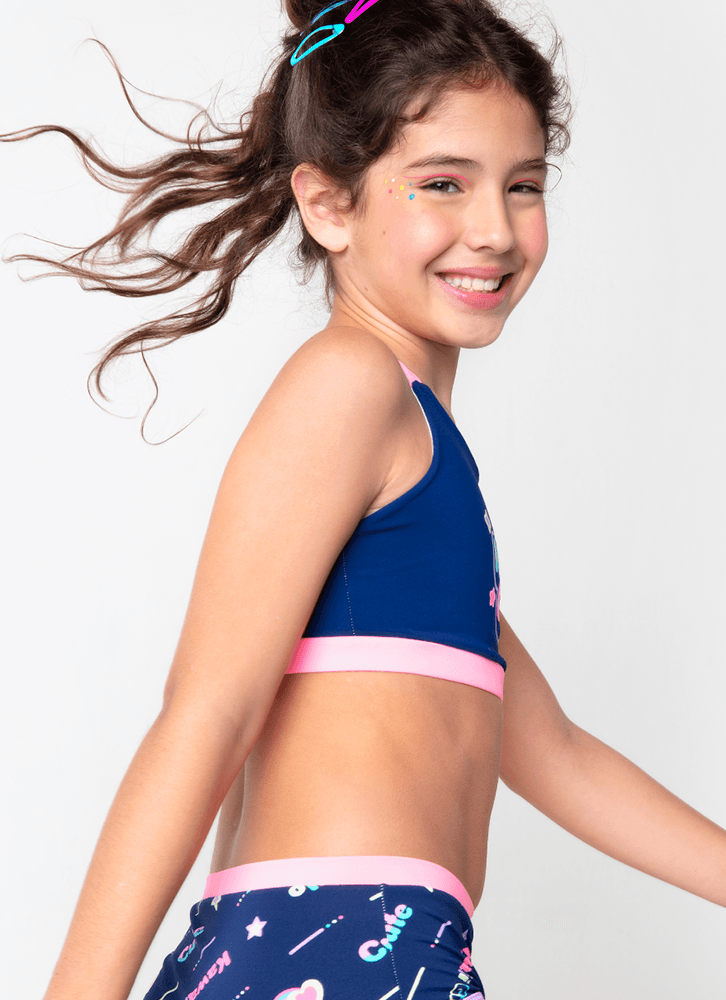 Biquini teen. Top com estampa localizada de lettering e alças com cruzamento nas costas; calcinha em estampa corrida