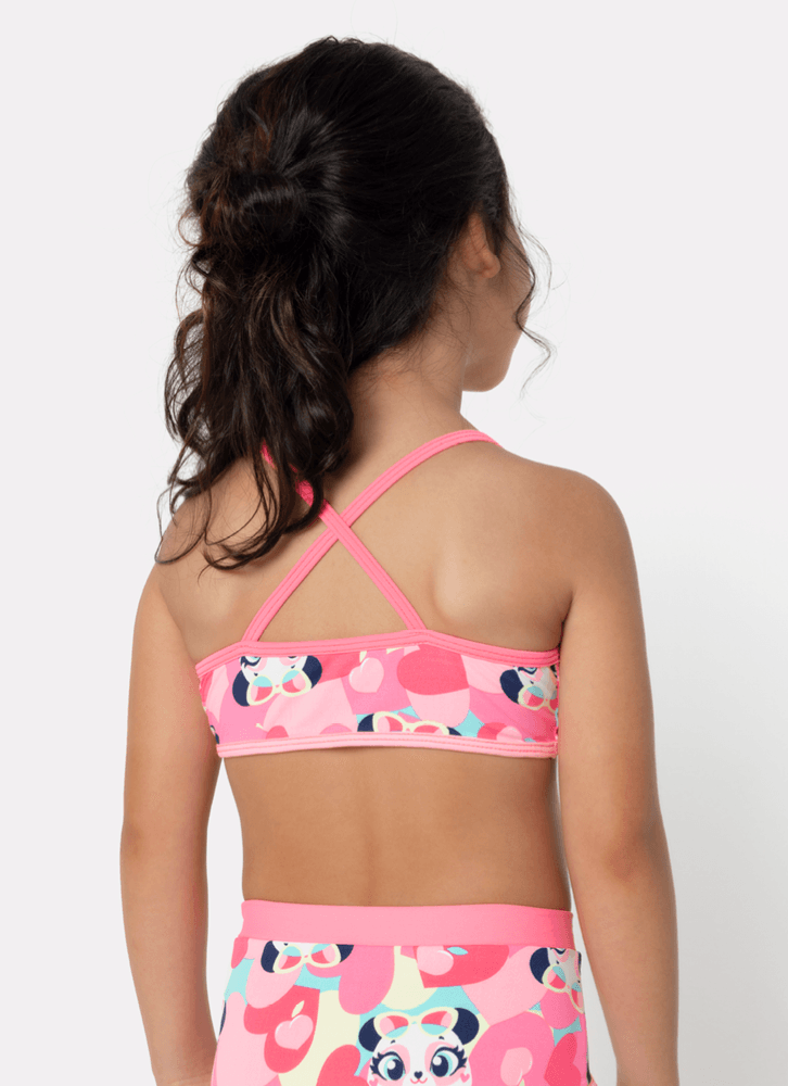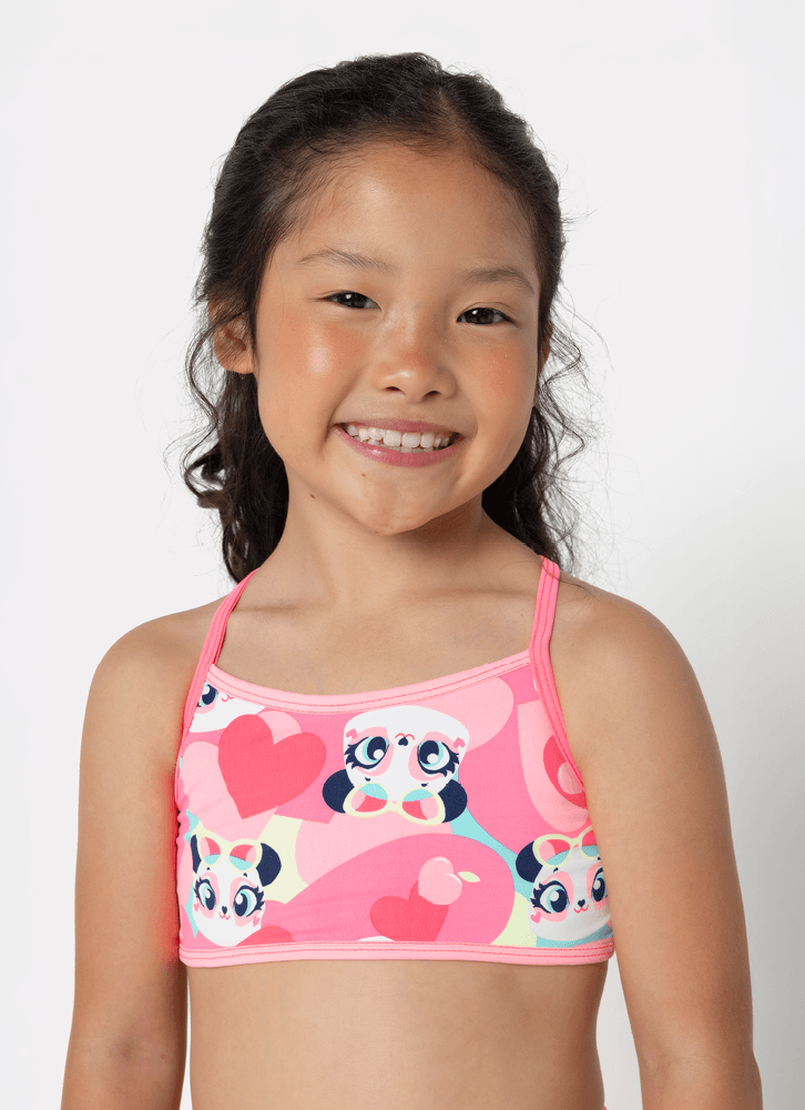Biquíni kids panda romântico. Possui estampa corrida e alças com cruzamento nas costas.