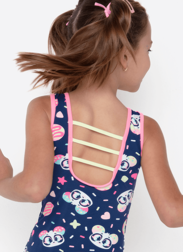 Maiô de natação kids Panda Donut. Possui estampa corrida e aplique de viés triplo nas costas.