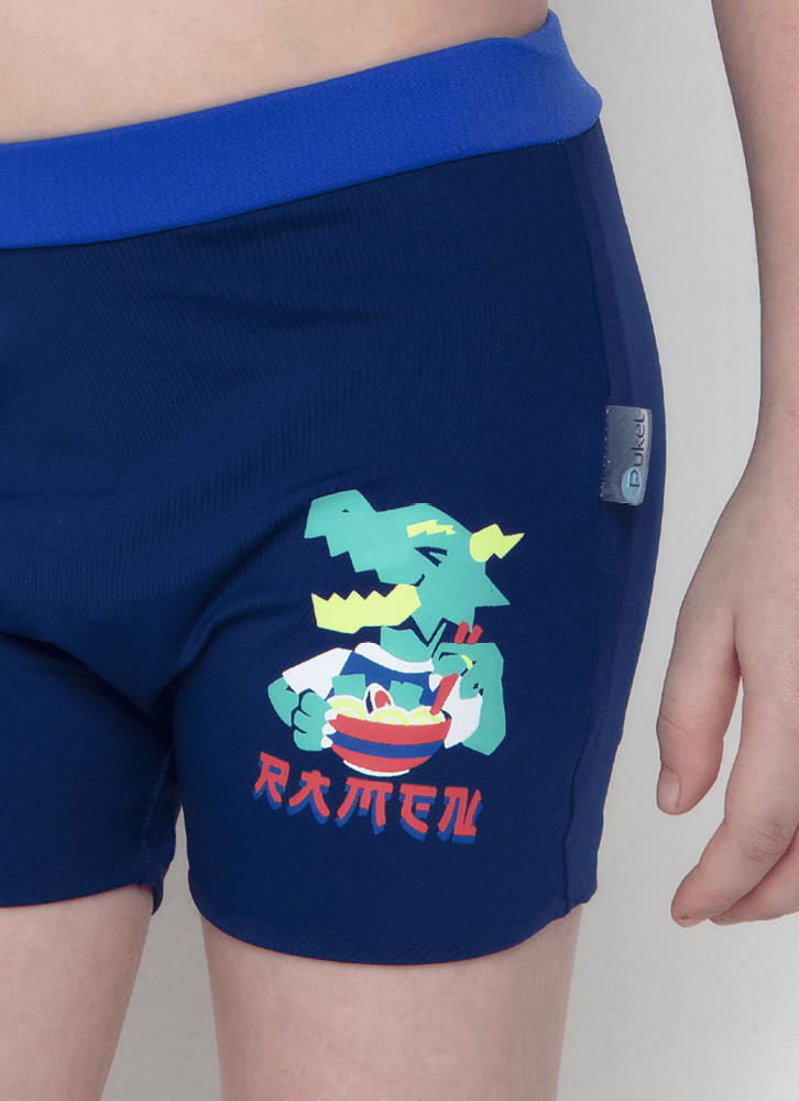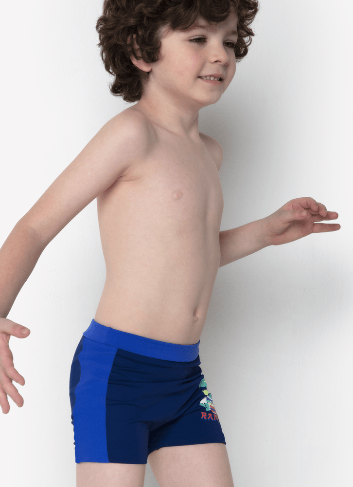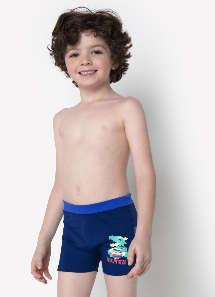 Sunga boxer. Possui cós com elástico embutido e cordão interno para ajuste, recorte lateral e estampa em silk.