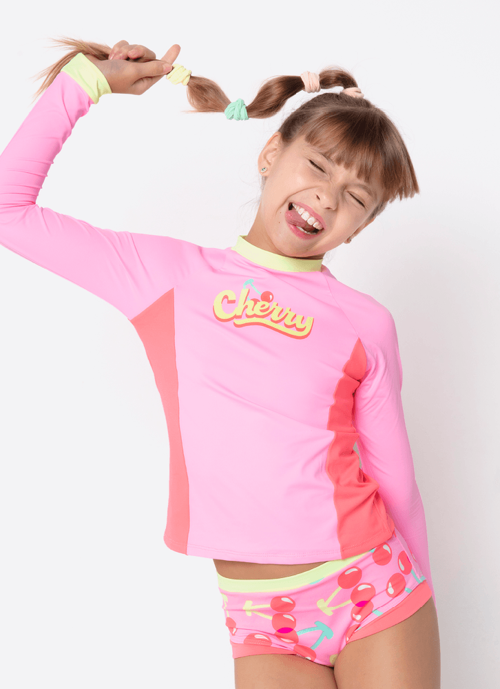 Conjunto com camiseta teen. Possui recorte lateral colorido, manga longa raglan com punho e silk print localizado. Calcinha em estampa corrida.