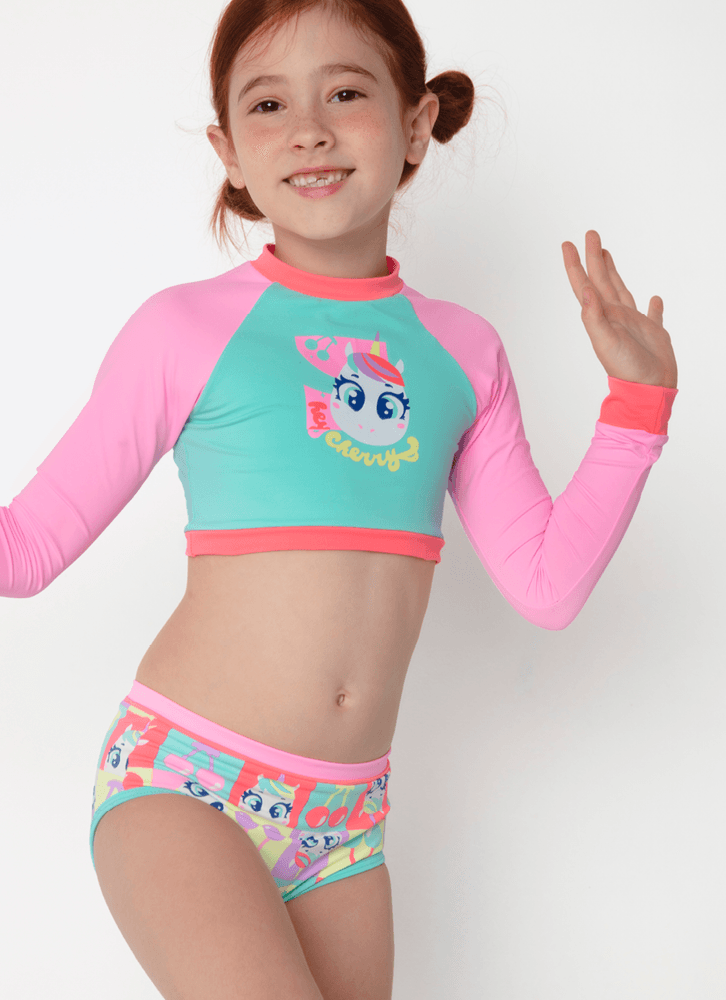 Conjunto cropped kids Uni cherry. Possui manga longa raglan, estampa localizada em silk no top, estampa corrida na calcinha.