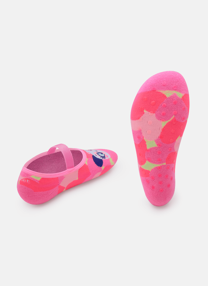 Possui acabamento em viés e elástico confortável. Solado com antiderrapante com aroma de morango.